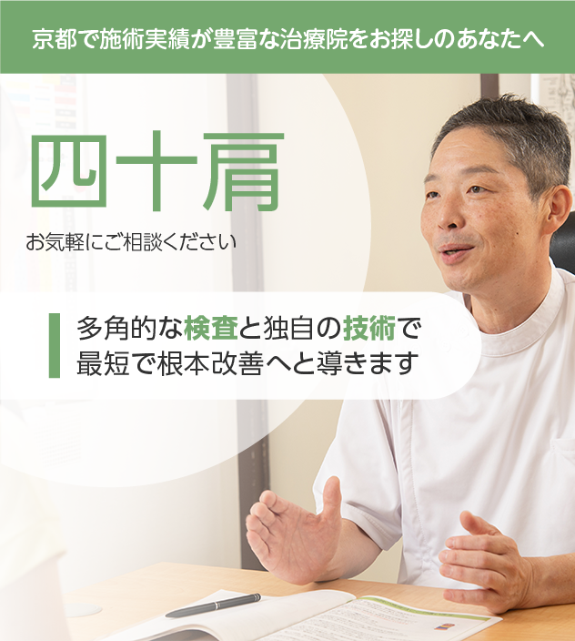 当院には様々な症状の方が来院されますが、その中でも四十肩を感じている方の割合は高く、多くの方の大きなお悩みの一つです。